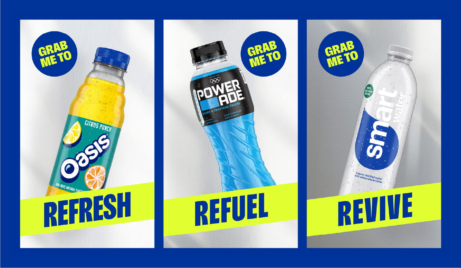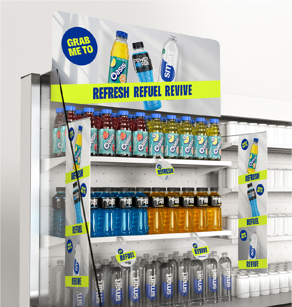 The visual language was bold, choice-centred and flavour-driven, encouraging shoppers to Refresh, Refuel or Revive. Each call-out celebrated the unique benefit of each drink brand, while striking typography tied the story together.
